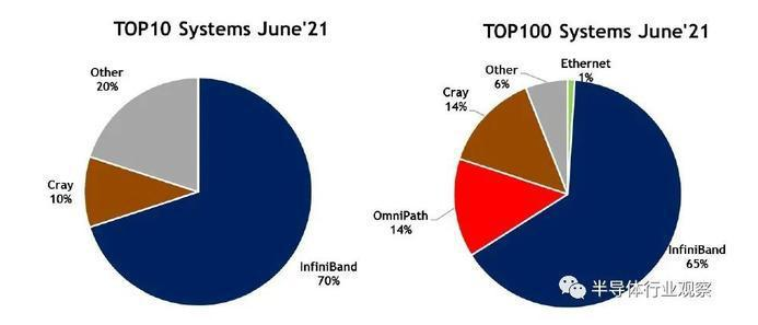在 Top100 中,Cray 互连不仅包括第一台 Slingshot 机器,还包括一堆使用上一代“Aries”互连的机器。2021 年 6 月的 Top100 榜单中有 5 台 Slingshot 机和 9 台 Aries 机。如果你称之为 Slingshot Ethernet,那么 Ethernet 拥有 6% 的份额,而专有的 Cray 则下降到 9%;如果你将 Mellanox/Nvidia InfiniBand 添加到 Intel Omni-Path,InfiniBand 在 Top100 中有 79 台机器。
