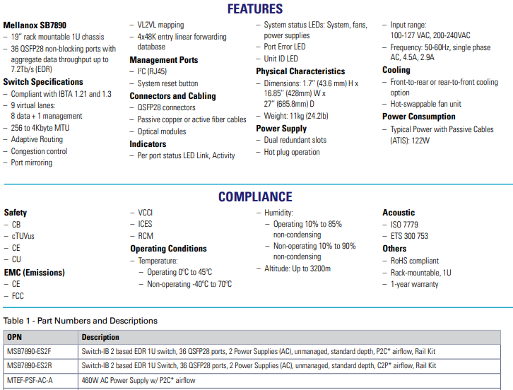 - 36 x EDR 100Gb/s 端口在 1U 开关中
