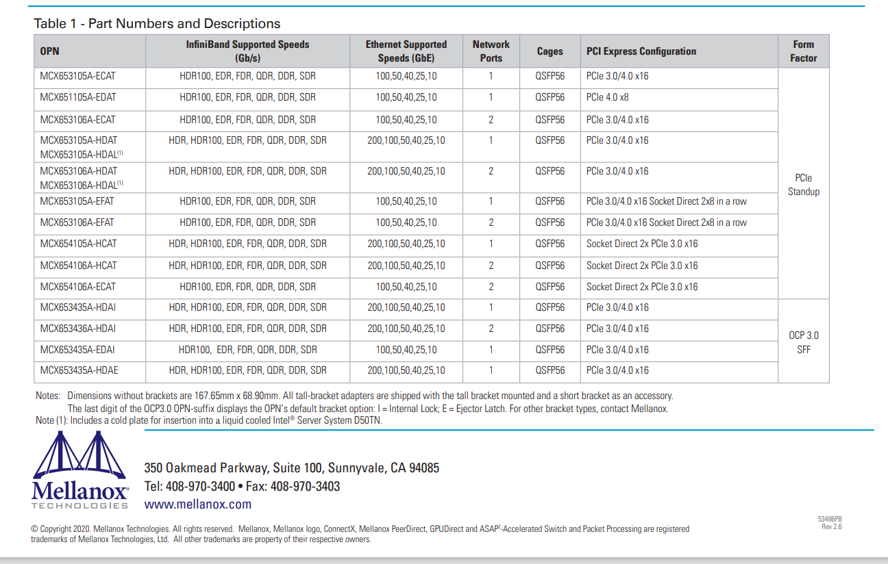 ConnectX-6 VPI 支持 HDR、HDR100、EDR、FDR、QDR、DDR 和 SDR 英菲尼班德速度以及 200、100、50、40、25 和 10Gb/s 以太网速度。