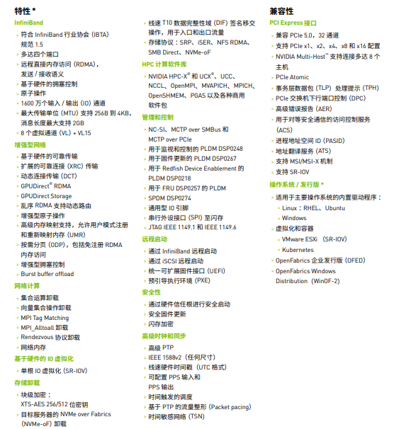 ConnectX-7 的智能网络计算加速引擎包括集合加速、MPI Tag Matching 和 MPI_Alltoall 引擎。这些性能优势以及前后向兼容性的标准保证,能够确保计算和数据密集型应用 程序的出色性能和可扩展性,帮助用户保护其数据中心投资。 产品组合 > 单端口或双端口,每端口 400Gb/s 或 200Gb/s,端口采用 OSFP 连接器 > 双端口 200Gb/s,采用 QSFP 连接器 > PCIe 标卡半高半长(HHHL)外形规格,具有 NVIDIA Socket Direct™ 选项 > 开放计算项目 3.0 (OCP3.0)全高小卡(TSFF)和小卡(SFF) > 独立 ConnectX-7 专用集成电路(ASIC),支持 PCIe 交换机功能。